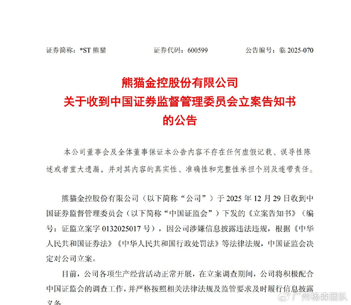 2025年12月29日,熊猫金控股份有限公司(公司或熊猫金控)披露收到中国证监会下发的《立案告知书》。因公司涉嫌信息披露违法违规,根据《证券法》《处罚法》等法律法规,中国证监会决定对公司立案。