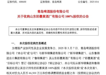 工商信息显示,鲁锦集团与新华锦分别持有即墨黄酒厂54.55%和45.45%股权。另据此前青岛啤酒公告内容显示,2024年,即墨黄酒实现主营业务收入1.66亿元,同比增长13.5%;实现净利润3047万元,同比增长38.0%。截至2024年12月31日,即墨黄酒总资产为9.08亿元,净资产为人民币2.03亿元。按照6.65亿元的收购价,其溢价超 3 倍。