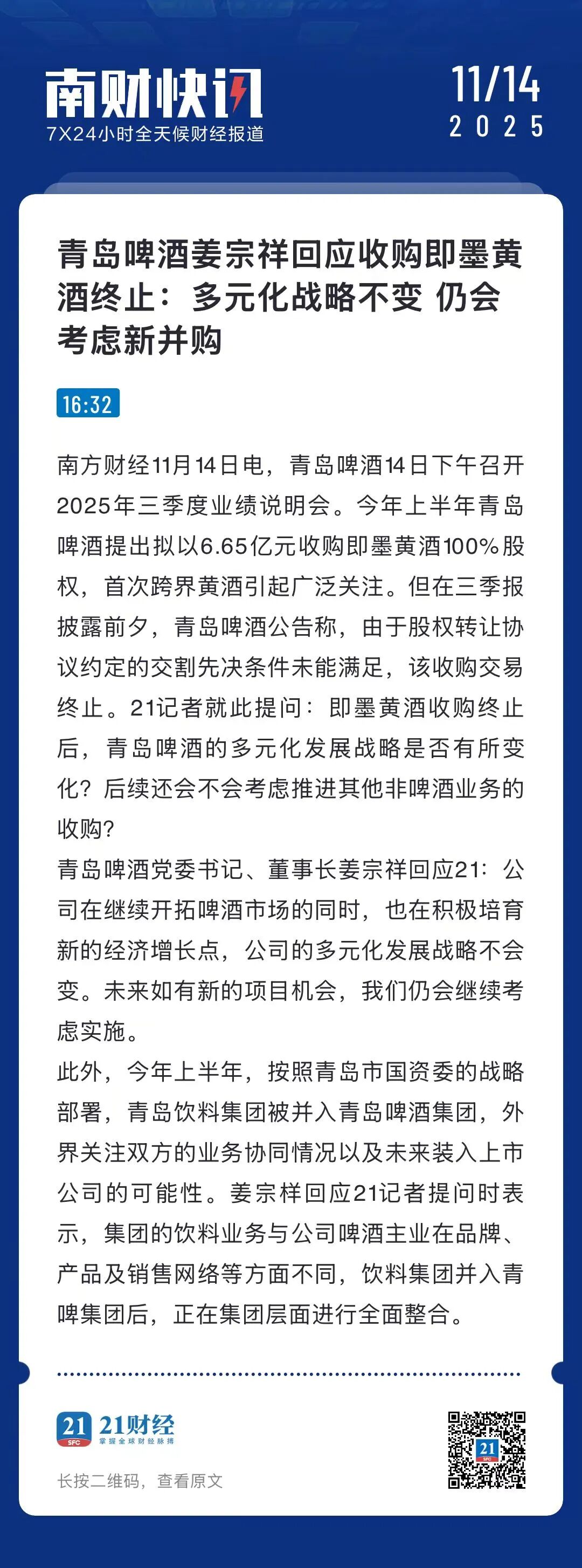 11月14日下午,青岛啤酒召开2025年三季度业绩说明会。今年上半年青岛啤酒提出拟以6.65亿元收购即墨黄酒100%股权,首次跨界黄酒引起广泛关注。