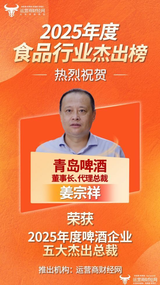 近日,由运营商财经网独家打造的“2025年度啤酒企业五大杰出总裁”名单正式推出,青岛啤酒董事长兼代理总裁姜宗祥成功入选!