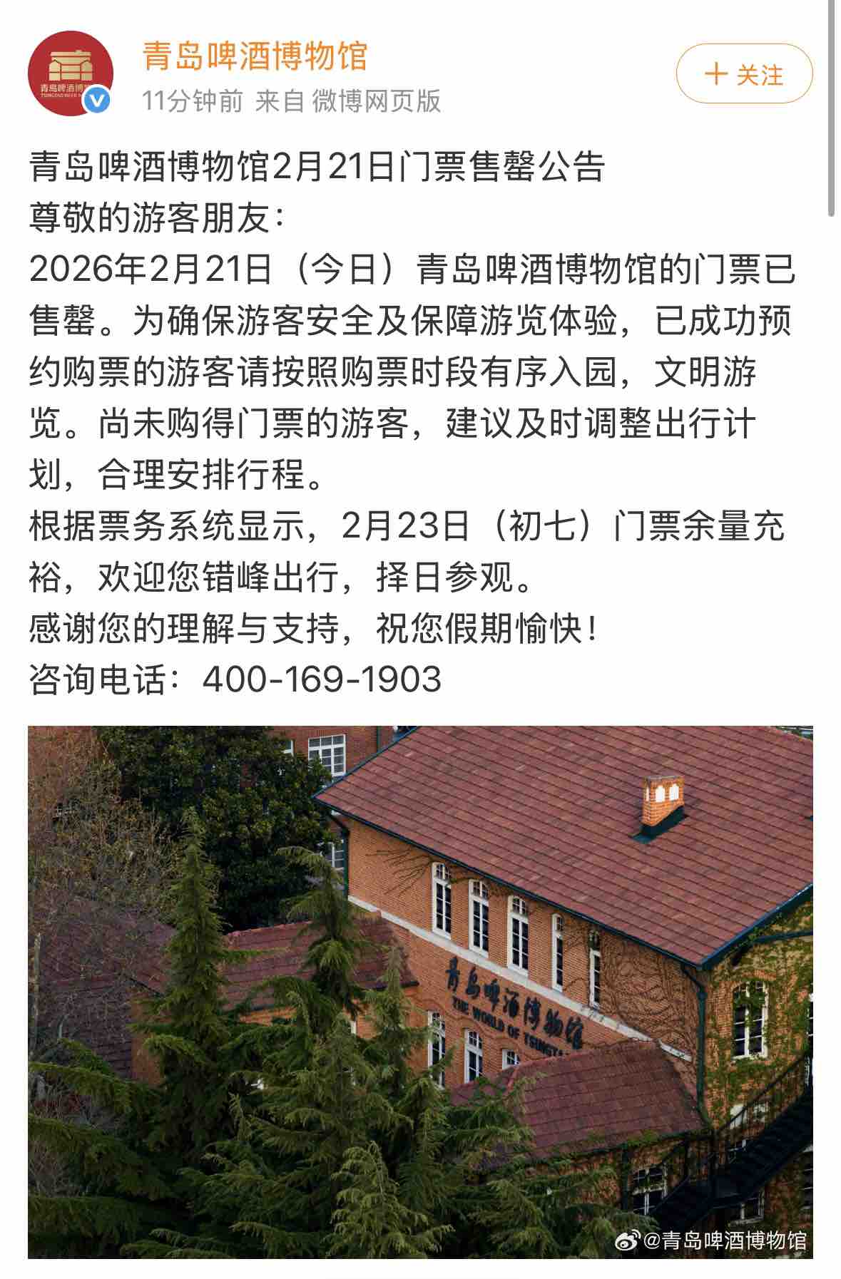 青岛日报社/观海新闻2月21日讯 21日上午,青岛啤酒博物馆发布公告,2026年2月21日(今日)青岛啤酒博物馆的门票已售罄,尚未购得门票的游客,建议及时调整出行计划,合理安排行程。