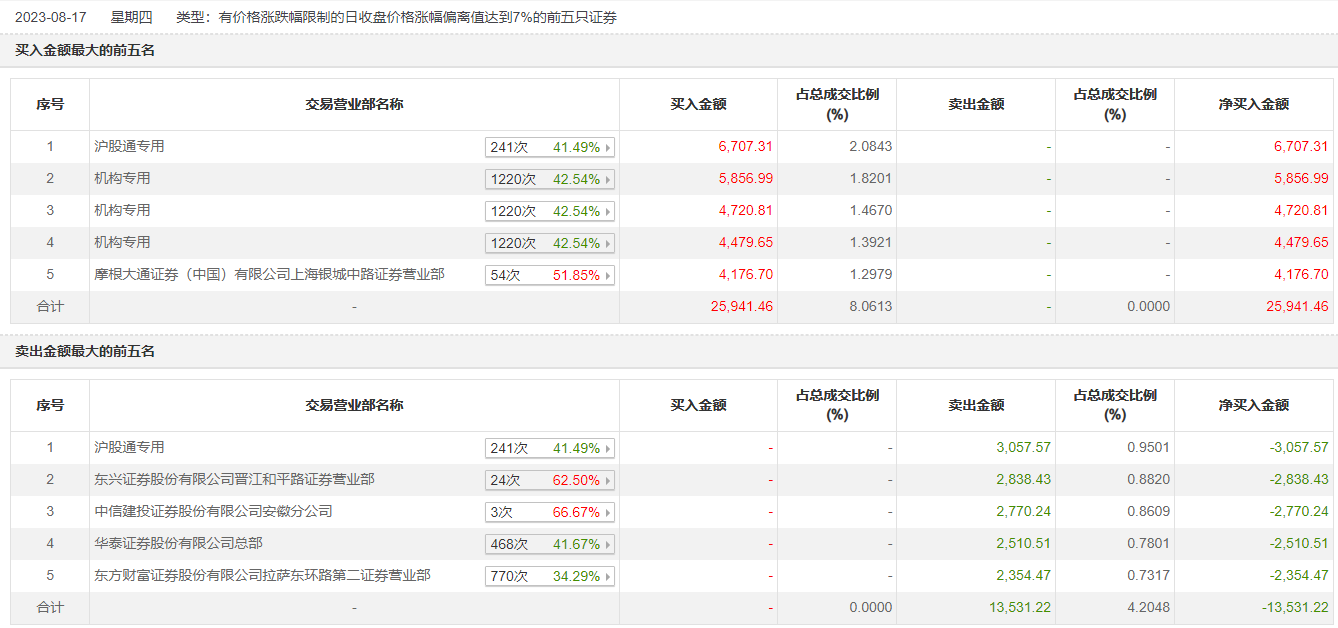 具体来看,机构合计净买入1.51亿元。此外,沪股通专用、摩根大通上海银城中路证券营业部分别买入6707.31万元、4176.70万元;沪股通专用、东兴证券晋江和平路证券营业部分别卖出3057.57万元、2838.43万元。