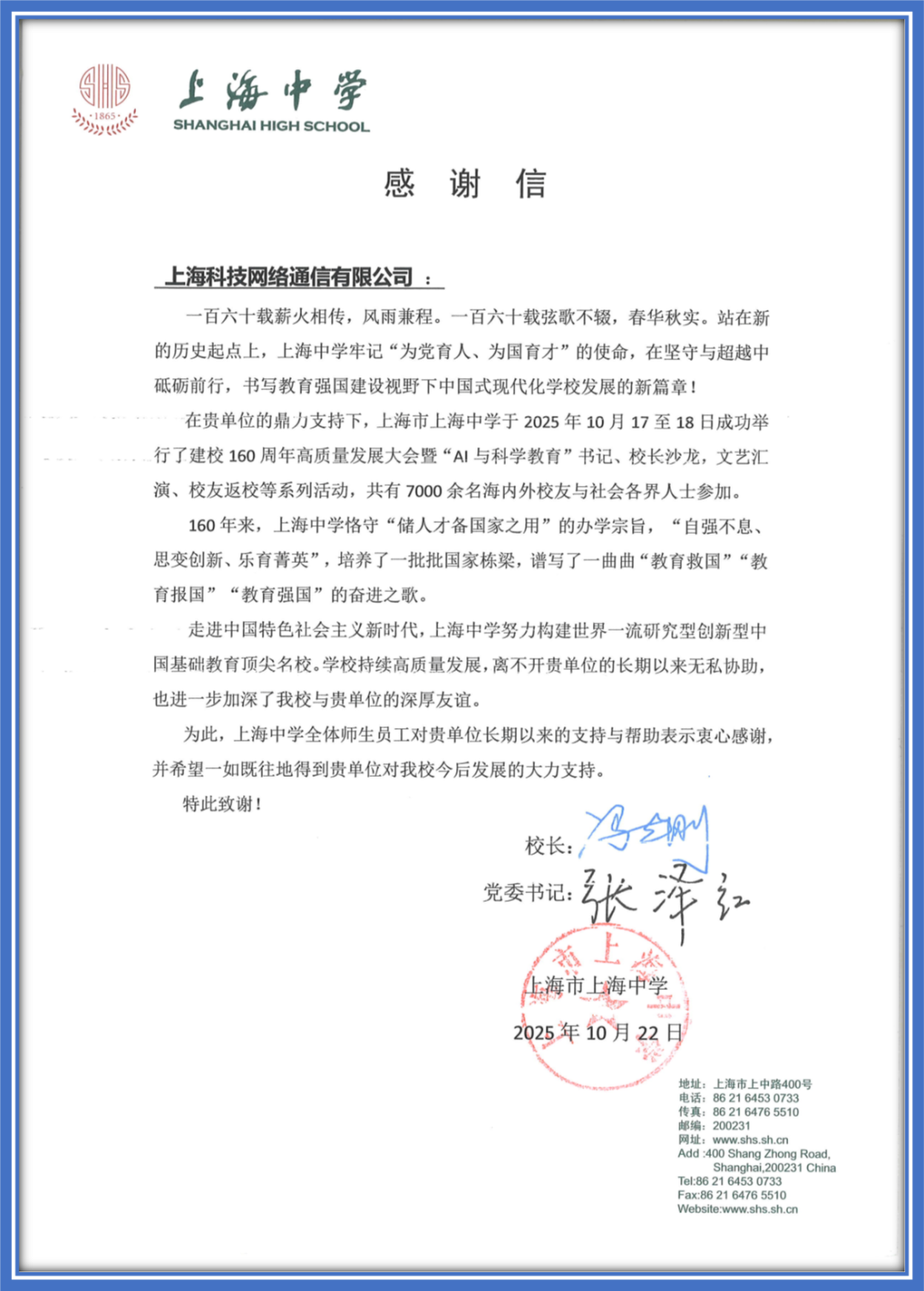 近日,云赛智联旗下企业上海科技网络通信有限公司收到了上海中学发来的感谢信,对上海科技网在上海中学举办建校160年高质量发展大会暨“AI与科学教育”书记、校长沙龙,文艺汇演、校友返校等系列活动中所提供的技术支持和服务保障工作,表示衷心感谢。