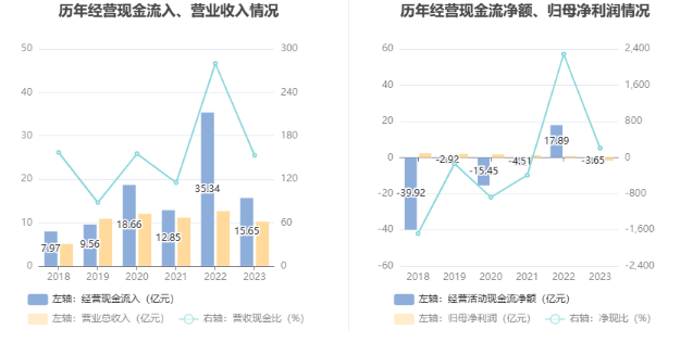 2023年,公司经营活动现金流净额为-3.65亿元,同比减少21.54亿元;筹资活动现金流净额-2.77亿元,同比增加4.28亿元;投资活动现金流净额-6334.97万元,上年同期为-4.39亿元。