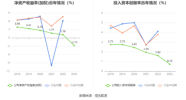 数据显示,2023年公司加权平均净资产收益率为-2.73%,较上年同期下降3.92个百分点;公司2023年投入资本回报率为0.72%,较上年同期下降0.90个百分点。