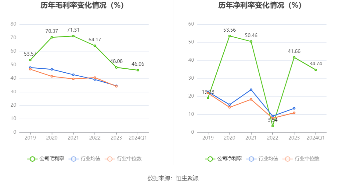 2024年第一季度,公司毛利率为46.06%,同比下降22.19个百分点;净利率为34.74%,较上年同期上升7.61个百分点。