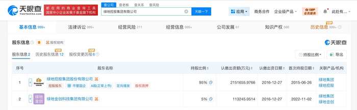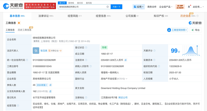 绿地控股集团有限公司成立于1992年7月,法定代表人为张玉良,注册资本约226.5亿人民币,经营范围为实业投资、绿化、仓储、房地产等,由绿地控股(600606)、绿地金创科技集团有限公司共同持股。风险信息显示,该公司现存30余条被执行人信息,被执行总金额超78亿元,此外,该公司还存在失信被执行人(老赖)、终本案件及多条股权冻结信息。