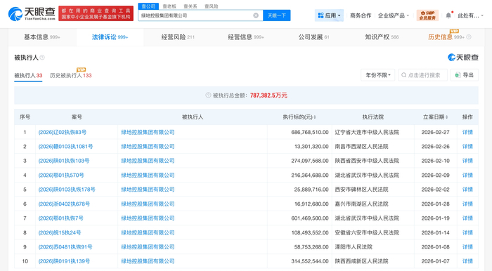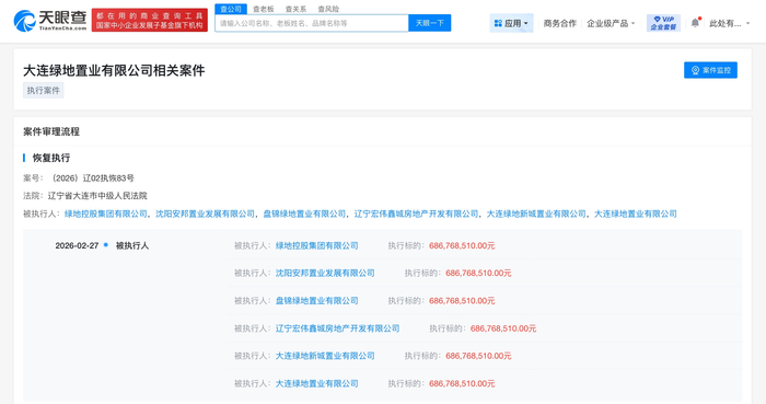 雷达财经讯,天眼查法律诉讼信息显示,2月27日,绿地控股集团有限公司、沈阳安邦置业发展有限公司、盘锦绿地置业有限公司等新增一则恢复执行信息,执行标的6.8亿余元,执行法院为辽宁省大连市中级人民法院。