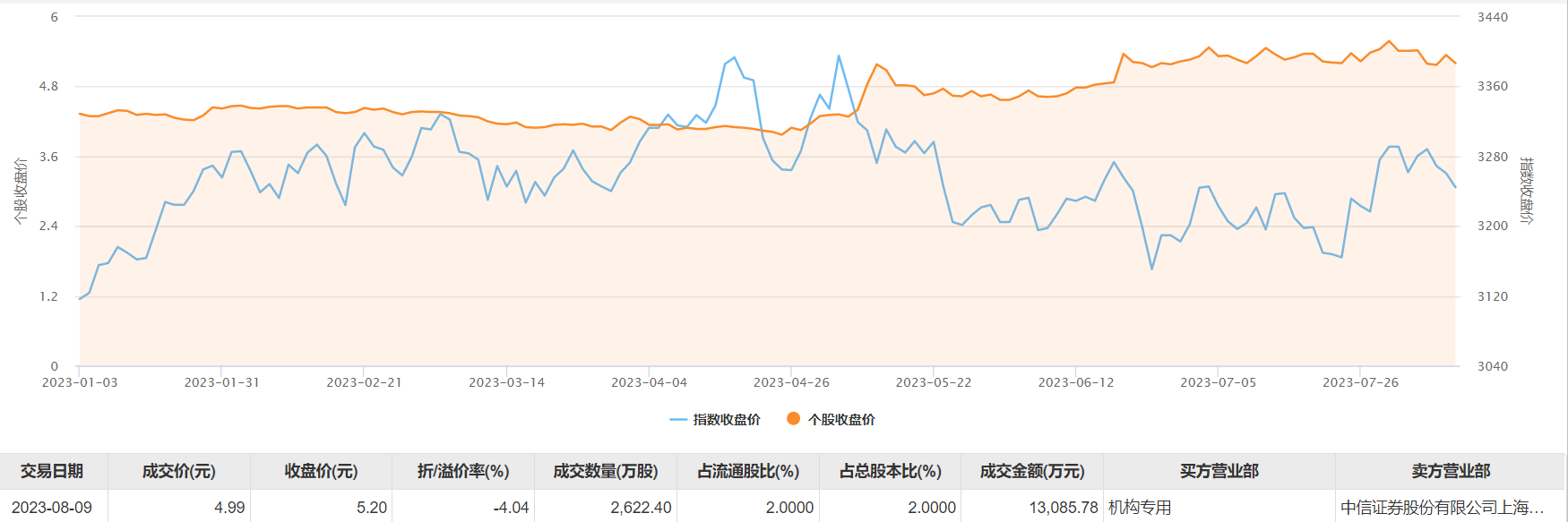 8月9日大宗交易成交2622.4万股,成交额1.31亿元,占当日总成交额的55.64%,成交价4.99元,较市场收盘价5.2元折价4.04%。