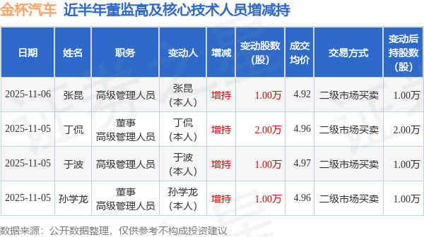 金杯汽车:11月5日至11月6日高管丁侃、张昆、孙学龙、于波增持股份合计5万股