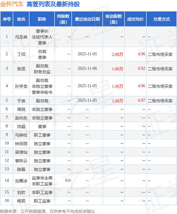 金杯汽车的高管列表及最新持股情况如下: