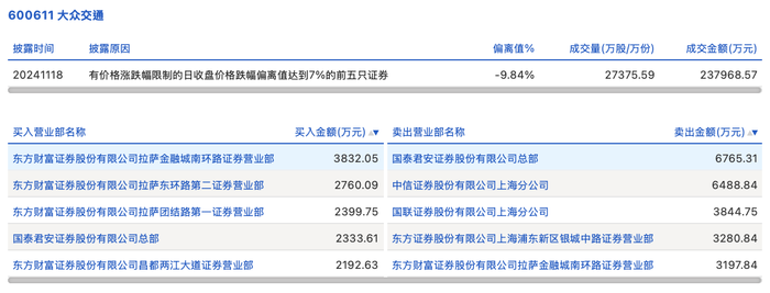 具体来看,国泰君安证券总部、中信证券上海分公司分别卖出6765.31万元、6488.84万元;东方财富证券拉萨金融城南环路证券营业部、东方财富证券拉萨东环路第二证券营业部分别买入3832.05万元、2760.09万元。