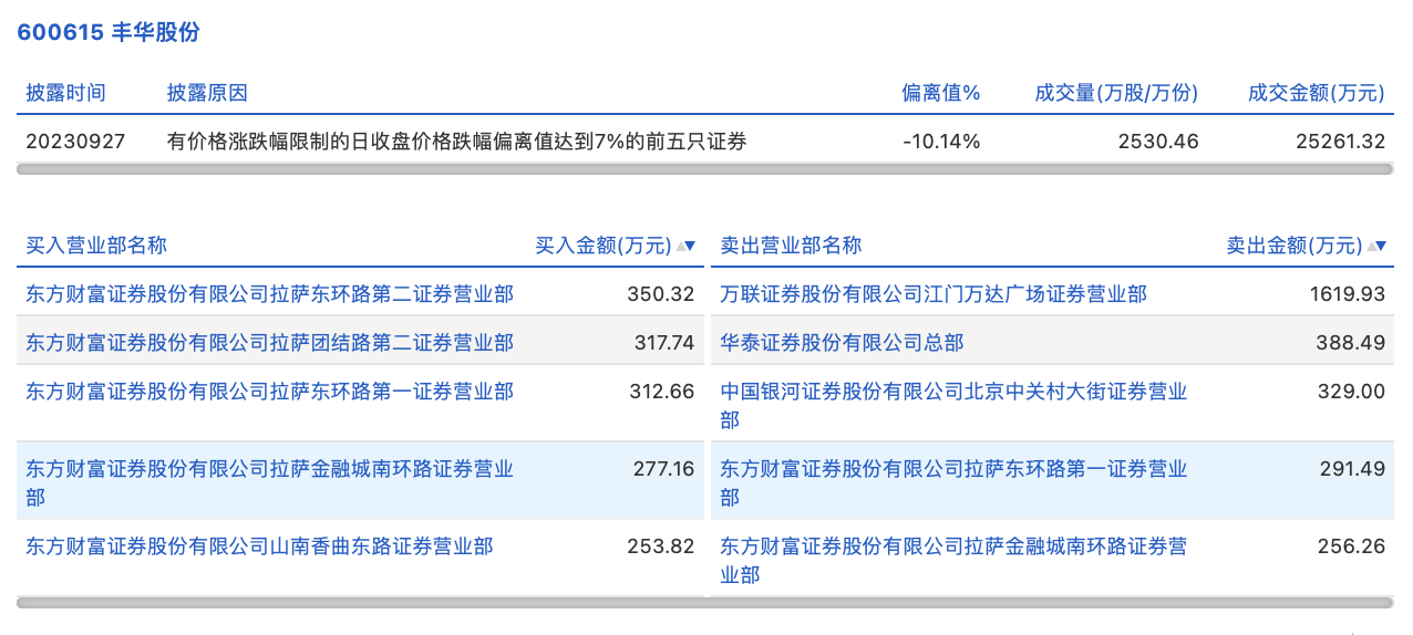 9月27日,丰华股份今日跌停,全天换手率达13.49%,振幅达3.81%。龙虎榜数据显示,营业部席位合计净卖出1373.48万元。其中,万联证券江门万达广场证券营业部、华泰证券总部分别卖出1619.93万元、388.49万元;东方财富证券拉萨东环路第二证券营业部、东方财富证券拉萨团结路第二证券营业部分别买入350.32万元、317.74万元。