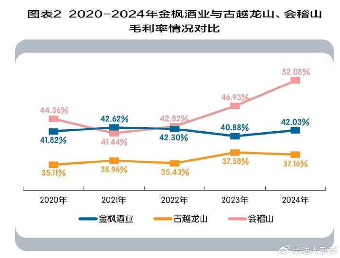 如图表2所示,同期内,古越龙山的毛利率保持在35%左右,虽然营业收入和归母净利润都远超金枫酒业,但是古越龙山的毛利率却不及金枫酒业。而会稽山的毛利率则颇高,达到40%以上,2024年创历史新高,达到52.08%。
