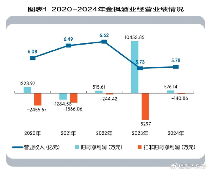 近五年,2020年-2024年,金枫酒业业绩较为“惨淡”,如图表1所示,公司营业收入分别为6.08亿元、6.49亿元、6.62亿元、5.73亿元、5.78亿元,归母净利润起伏较大,2021年亏损1824.58万元,2023年又增长至1.05亿元,2024年又骤降至576.14万元。然而,同期内,公司扣非归母净利润一直处于亏损状态,分别为-2455.67万元、-1866.06万元、-244.42万元、-5297.00万元、-140.86万元,已经连续5年为负。