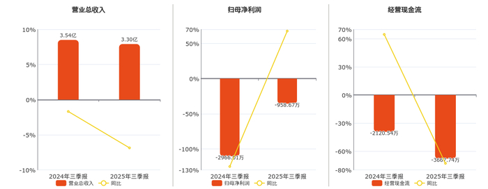 公司营业总收入为3.30亿元。归母净利润为-958.67万元,较去年同报告期归母净利润增加2007.34万元。经营活动现金净流入为-3667.74万元。