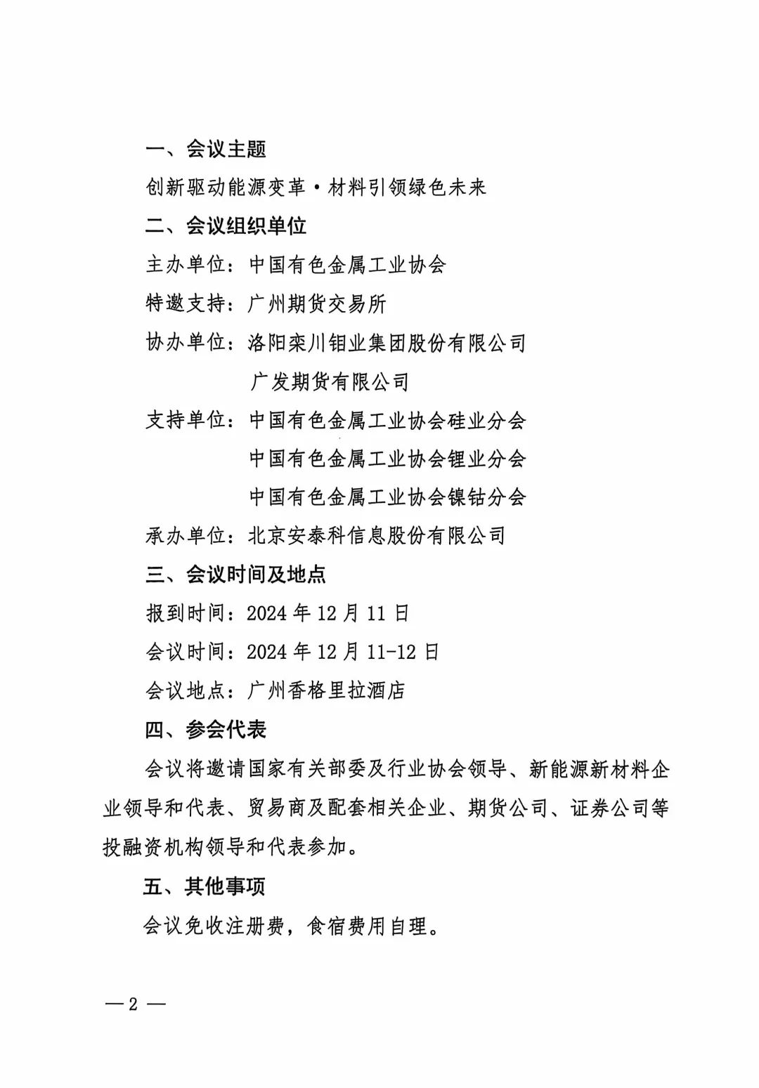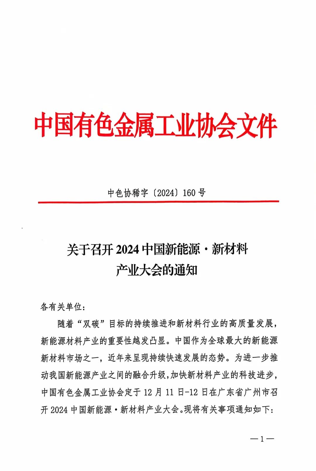 随着“双碳”目标的持续推进和新材料行业的高质量发展,新能源材料产业的重要性越发凸显。中国作为全球最大的新能源新材料市场之一,近年来呈现持续快速发展的态势。为进一步推动我国新能源产业之间的融合升级,加快新材料产业的科技进步,中国有色金属工业协会定于12月11日—12日在广东省广州市召开2024中国新能源·新材料产业大会。