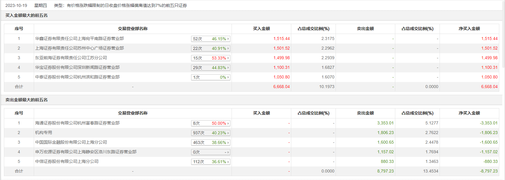 10月19日,海立股份今日涨停,全天换手率达11.04%,振幅达11.64%。龙虎榜数据显示,营业部席位合计净卖出2129.19万元。其中,机构合计净卖出1806.23万元。此外,炒股养家(华鑫证券上海宛平南路证券营业部)、上海证券苏州中心广场证券营业部分别买入1515.44万元、1501.52万元;海通证券杭州富春路证券营业部、中国国际金融上海分公司分别卖出3353.01万元、1600.65万元。