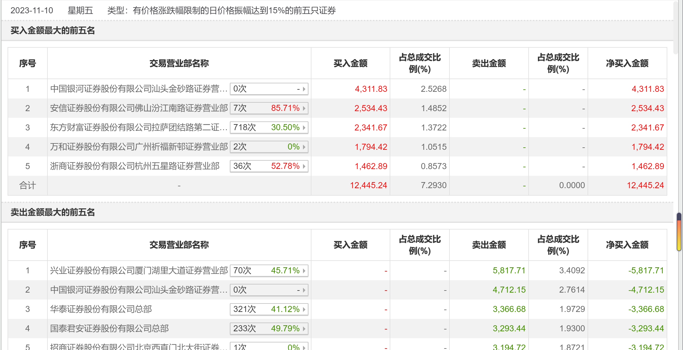 11月10日,海立股份今日跌8.56%,全天换手率达24.14%,振幅达20.09%。龙虎榜数据显示,营业部席位合计净卖出7939.46万元。其中,兴业证券厦门湖里大道证券营业部、中国银河证券汕头金砂路证券营业部分别卖出5817.71万元、4712.15万元;中国银河证券汕头金砂路证券营业部、安信证券佛山汾江南路证券营业部分别买入4311.83万元、2534.43万元。