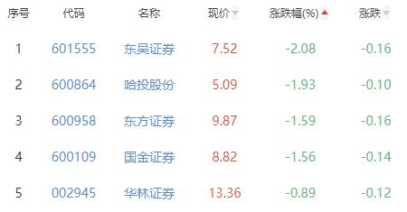 东吴证券、哈投股份、东方证券、国金证券、华林证券位列涨幅榜后五位,涨幅分别为-2.08%、-1.93%、-1.59%、-1.56%、-0.89%。
