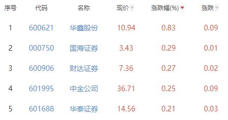其中,华鑫股份、国海证券、财达证券、中金公司、华泰证券位列板块涨幅前五位,涨幅分别为0.83%、0.29%、0.27%、0.25%、0.21%。