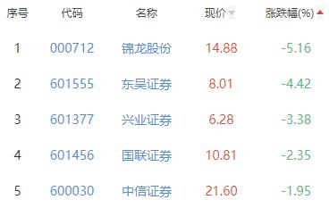 锦龙股份、东吴证券、兴业证券、国联证券、中信证券位列涨幅榜后五位,涨幅分别为-5.16%、-4.42%、-3.38%、-2.35%、-1.95%。