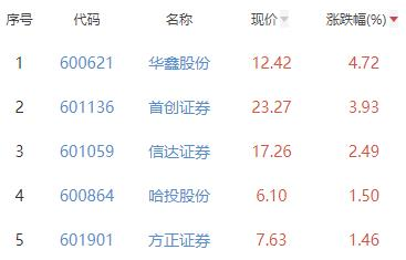 其中,华鑫股份、首创证券、信达证券、哈投股份、方正证券位列板块涨幅前五位,涨幅分别为4.72%、3.93%、2.49%、1.50%、1.46%。