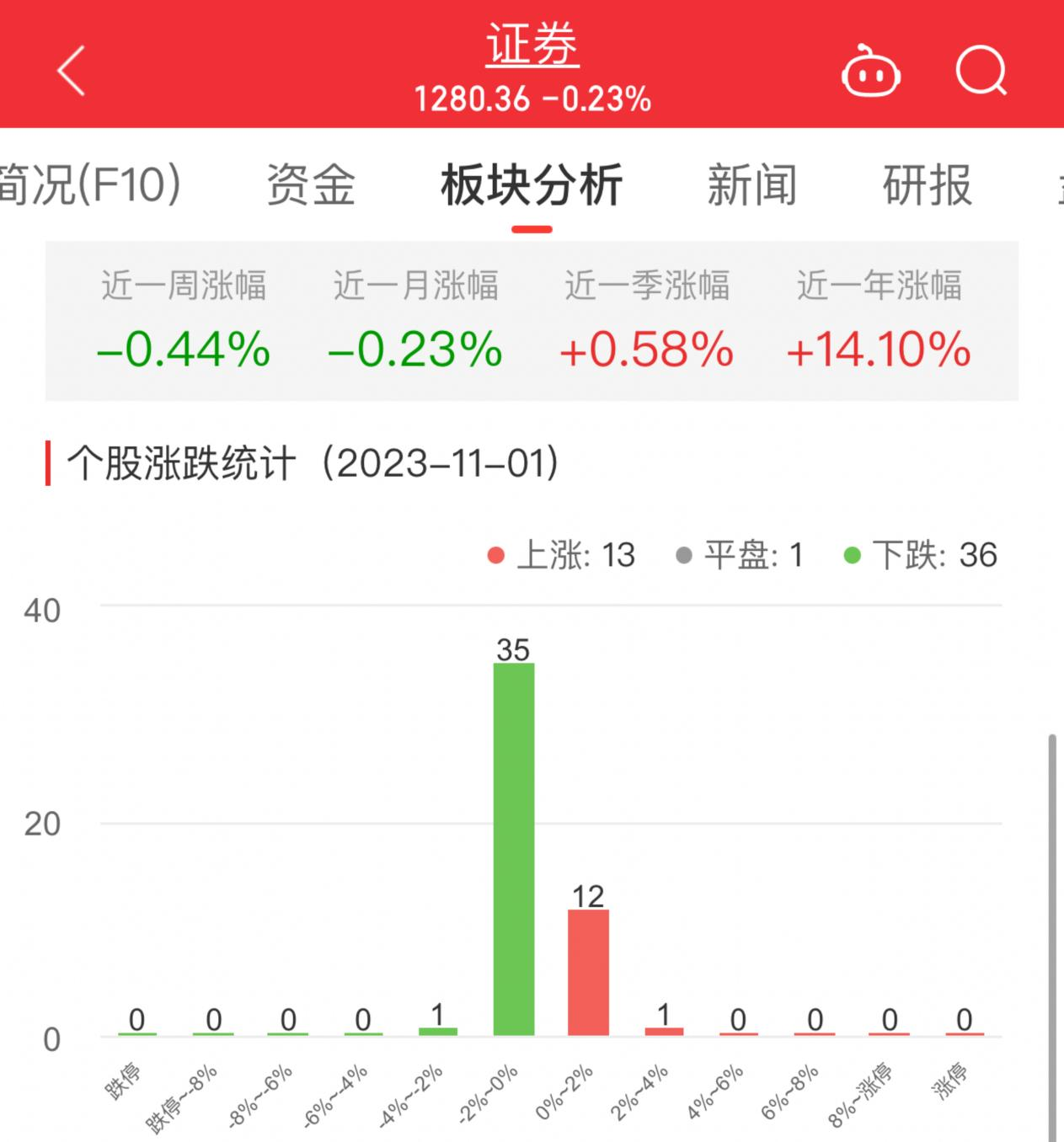 中国经济网北京11月1日讯 今日,证券板块整体跌幅0.23%,其中13只股票上涨,1只股票平盘,36只股票下跌。