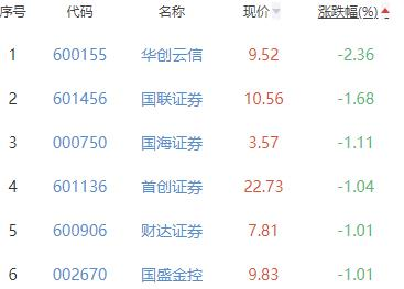 华创云信、国联证券、国海证券、首创证券、财达证券、国盛金控(维权)位列涨幅榜后五位,涨幅分别为-2.36%、-1.68%、-1.11%、-1.04%、-1.01%、-1.01%。