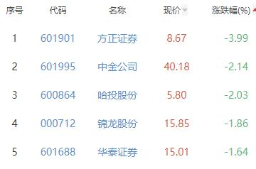 方正证券、中金公司、哈投股份、锦龙股份、华泰证券位列涨幅榜后五位,涨幅分别为-3.99%、-2.14%、-2.03%、-1.86%、-1.64%。