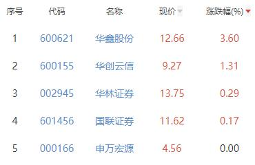 其中,华鑫股份、华创云信、华林证券、国联证券、申万宏源位列板块涨幅前五位,涨幅分别为3.60%、1.31%、0.29%、0.17%、0.00%。