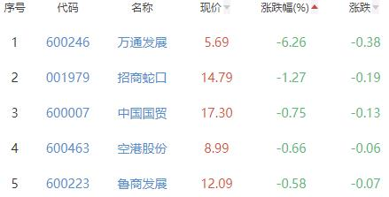 万通发展、招商蛇口、中国国贸、空港股份、鲁商发展位列涨幅榜后五位,涨幅分别为-6.26%、-1.27%、-0.75%、-0.66%和-0.58%。