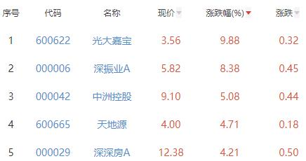 其中,光大嘉宝、深振业A、中洲控股、天地源、深深房A位列板块涨幅前五位,涨幅分别为9.88%、8.38%、5.08%、4.71%和4.21%。