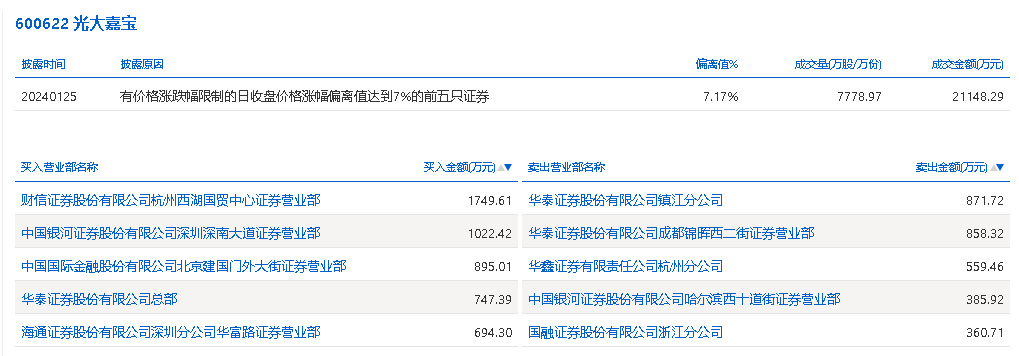 1月25日,光大嘉宝今日涨停,全天换手率5.19%,成交额2.11亿元,振幅10.63%。龙虎榜数据显示,营业部席位合计净买入2072.61万元。上交所公开信息显示,当日该股因日涨幅偏离值达7.17%上榜。