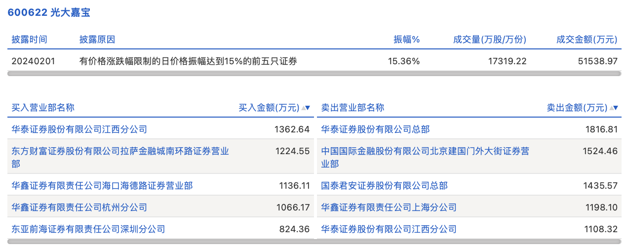 2月1日,光大嘉宝今日跌6.11%,龙虎榜数据显示,上榜营业部席位全天成交1.27亿元,占当日总成交金额比例为24.64%。其中,买入金额为5613.82万元,卖出金额为7083.25万元,合计净卖出1469.43万元。