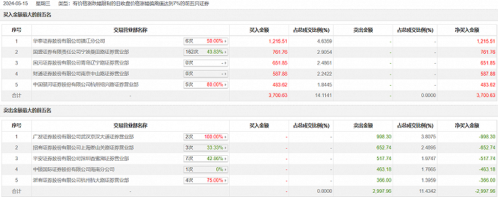 光大嘉宝5月15日涨停,龙虎榜数据显示,上榜营业部席位全天成交6698.58万元,占当日总成交金额比例为25.55%。其中,买入金额为3700.63万元,卖出金额为2997.96万元,合计净买入702.67万元。
