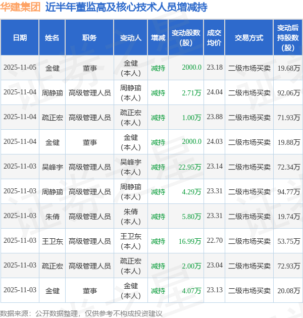 华建集团近半年内的董监高及核心技术人员增减持详情如下: