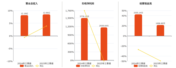 公司营业总收入为12.66亿元,在已披露的同业公司中排名第19,较去年同报告期营业总收入增加4750.09万元,同比较去年同期上涨3.90%。归母净利润为2939.64万元,在已披露的同业公司中排名第25,较去年同报告期归母净利润减少836.51万元,同比较去年同期下降22.15%。经营活动现金净流入为1696.80万元,在已披露的同业公司中排名第26,较去年同报告期经营活动现金净流入减少1658.34万元,同比较去年同期下降49.43%。
