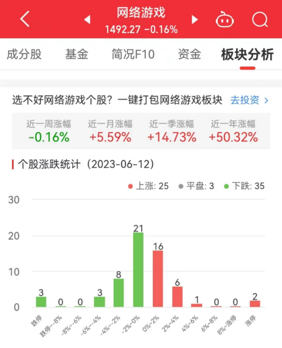 数据显示,截至今日,网络游戏板块近一周涨幅-0.16%,近一月涨幅5.59%,近一季涨幅14.73%。