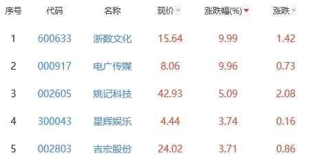 其中,浙数文化、电广传媒、姚记科技、星辉娱乐、吉宏股份位列板块涨幅前五位,涨幅分别为9.99%、9.96%、5.09%、3.74%、3.71%。