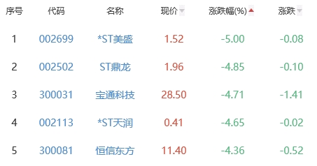 *ST美盛、ST鼎龙、宝通科技、*ST天润、恒信东方位列涨幅榜后五位,涨幅分别为-5.00%、-4.85%、-4.71%、-4.65%、-4.36%。