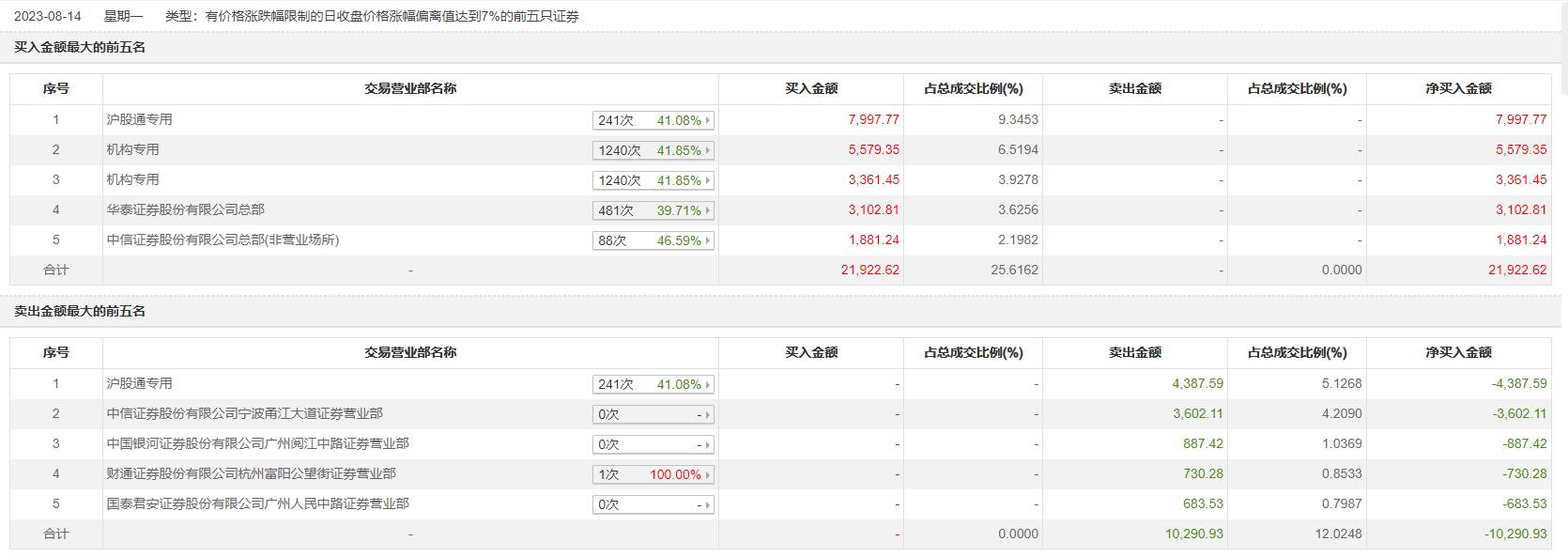 具体来看,机构合计净买入8940.8万元。此外,沪股通专用、华泰证券总部分别买入7997.77万元、3102.81万元;沪股通专用、中信证券宁波甬江大道证券营业部分别卖出4387.59万元、3602.11万元。