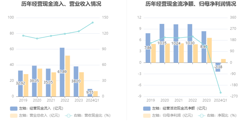 2024年第一季度,公司营业收入现金比为140.78%,净现比为-239.50%。