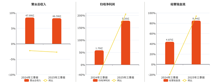 公司营业总收入为46.59亿元,较去年同报告期营业总收入减少1.30亿元,同比较去年同期下降2.71%。归母净利润为5.20亿元。经营活动现金净流入为9.44亿元。