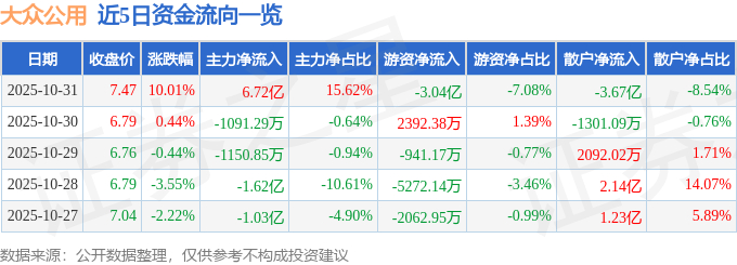 证券之星消息,大众公用10月31日涨停收盘,收盘价7.47元。该股于10点17分涨停,11次打开涨停,截止收盘封单资金为2807.9万元,占其流通市值0.16%。
