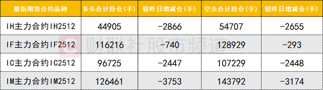四大期指主力合约中,IH、IF、IC、IM合约多空双方均减仓,IM合约多头减仓数量较多。