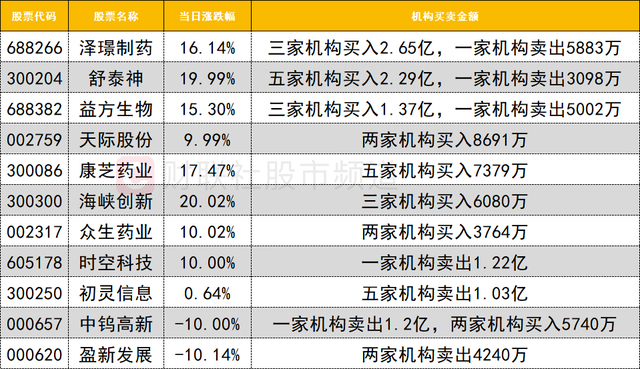 今日龙虎榜机构活跃度较高,泽璟制药获三家机构买入2.65亿,但同时遭一家机构卖出5883万。今日舒泰神20CM涨停,获五家机构买入2.29亿,但同时遭一家机构卖出3098万。益方生物获三家机构买入1.37亿,但同时遭一家机构卖出5002万。