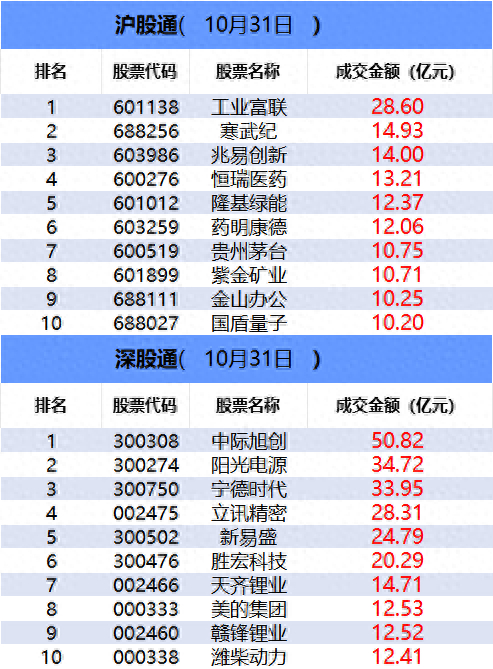 从沪股通前十大成交个股来看,工业富联位居首位;寒武纪和兆易创新分居二、三位。