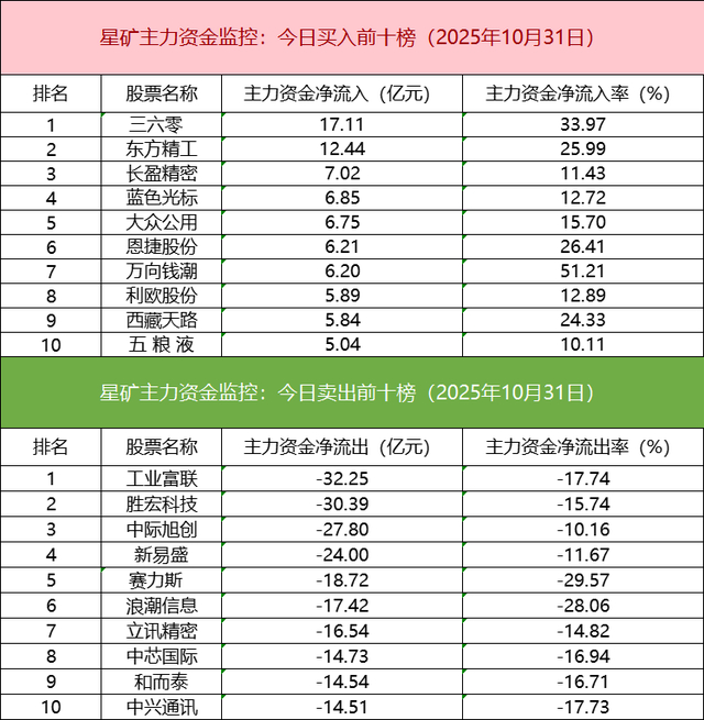 主力资金流出前十的个股所属板块较为分散,工业富联净流出居首。