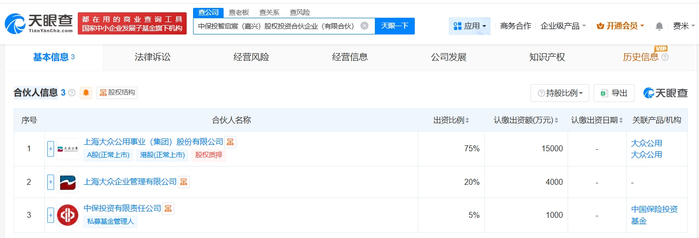 雷达财经讯,天眼查App显示,近日,中保投智启宸(嘉兴)股权投资合伙企业(有限合伙)成立,执行事务合伙人为中保投资有限责任公司,出资额2亿人民币,经营范围为股权投资、创业投资。合伙人信息显示,该合伙企业由大众公用(600635)、上海大众企业管理有限公司、中保投资有限责任公司共同出资。